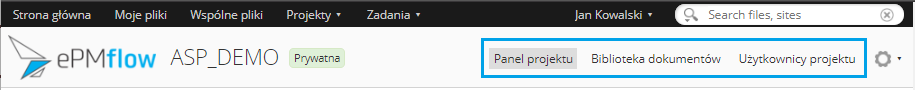 Dostęp do zawartości jest możliwy poprzez menu z prawej strony ekranu panelu projektu.