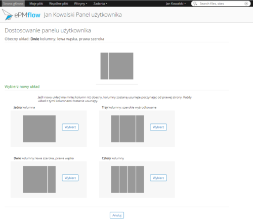 Wygląd panelu użytkownika dostosujemy klikając przycisk „Zmiana układu” i wybierając jedną z dostępnych opcji.