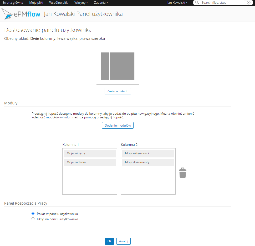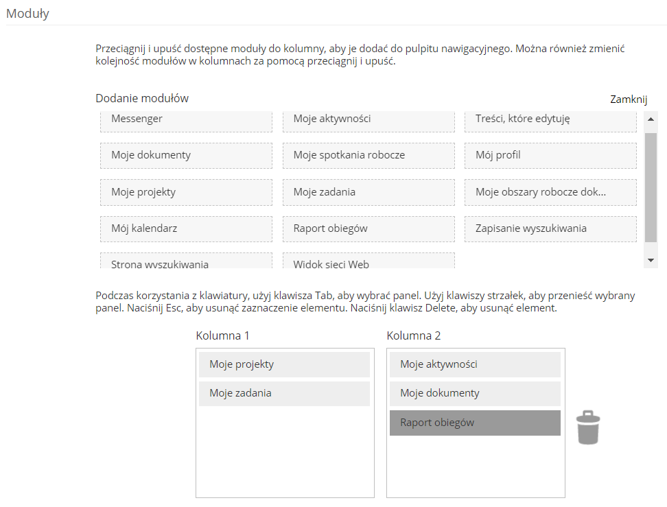 Zawartość panelu użytkownika dostosujemy klikając przycisk „Dodanie modułów”. Następnie wybrane moduły przeciągamy i upuszczamy do wybranej kolumny. Można również zmienić kolejność modułów w kolumnach za pomocą przeciągnij i upuść.