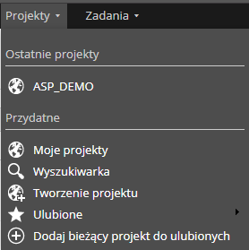 - Projekty – skrót ułatwiający dostęp do projektów użytkownika. Korzystając z rozwijanej listy możemy:
