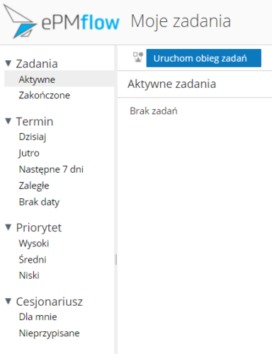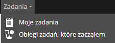 - Moje zadania – umożliwia przeglądanie zadań przypisanych do użytkownika i zarządzanie nimi. Na stronie „Moje zadania” użytkownik może wyświetlić podsumowanie swoich zadań, przefiltrować listę zadań i uzyskać dostęp do działań związanych z zarządzaniem zadaniami. Można także uruchomić nowy obieg zadań,