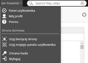 Rozwijane menu pod nazwą użytkownika (prawy górny róg) umożliwia dostęp do opcji związanych z profilem użytkownika: