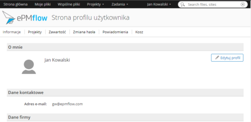 - Informacje – podstawowe dane wprowadzone przez Administratora Platformy ePMflow. Dane te można uzupełnić o dodatkowe informacje klikając przycisk „Edytuj profil”,