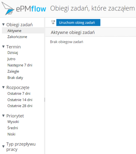 Obiegi zadań, które zacząłem – umożliwia wyświetlanie i zarządzanie zainicjowanymi obiegami zadań. Na stronie tej użytkownik może wyświetlić podsumowanie obiegów zadań, przefiltrować listę obiegów zadań i anulować obieg zadań.